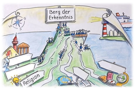 Die Themen sind dementsprechend vielfältig und reichen in den Klassen 5-7 von z.B. Zeit und Umwelt Jesu oder Christliche Feste und Feiertage über Freundschaft oder Identität, Vorbild und Selbstbild bis hin zu Judentum und Islam und dem interreligiösen Dialog. In der Oberstufe geht es um die Frage nach Gott, dem Menschen, dem richtigen Handeln und den Religionen in der Gesellschaft. Dabei bietet der Religionsunterricht stets Raum für aktuelle Themen und Fragen. Das Ziel ist es, den SchülerInnen Orientierung aus christlicher Sicht zu geben und ihnen gleichzeitig zu zeigen, dass viele Wege auf den Berg der Erkenntnis führen …