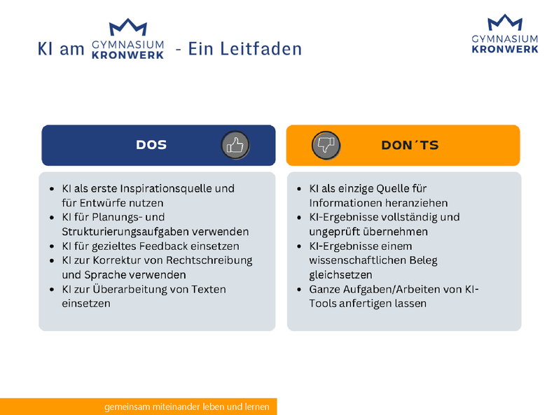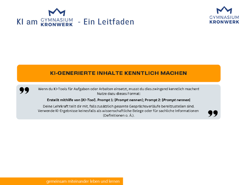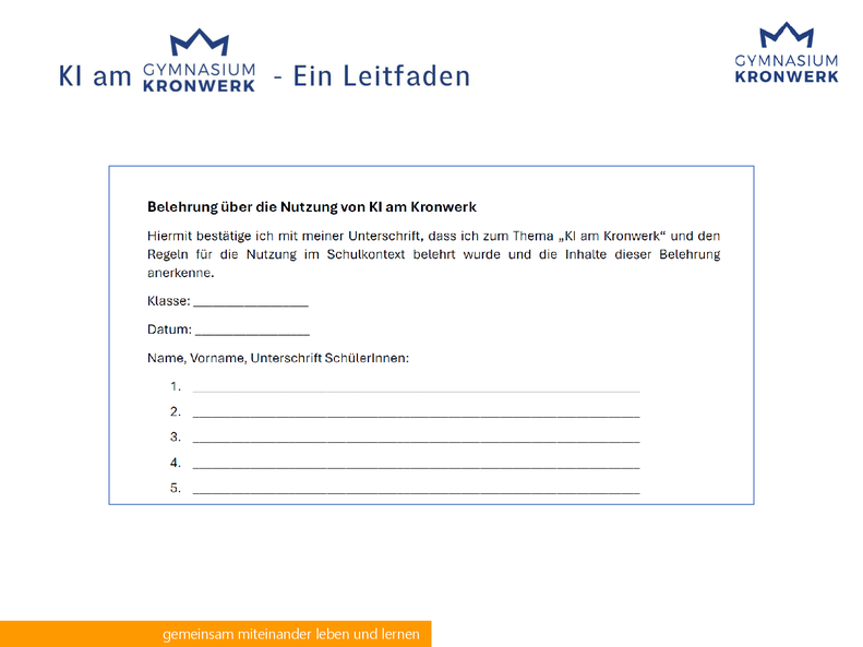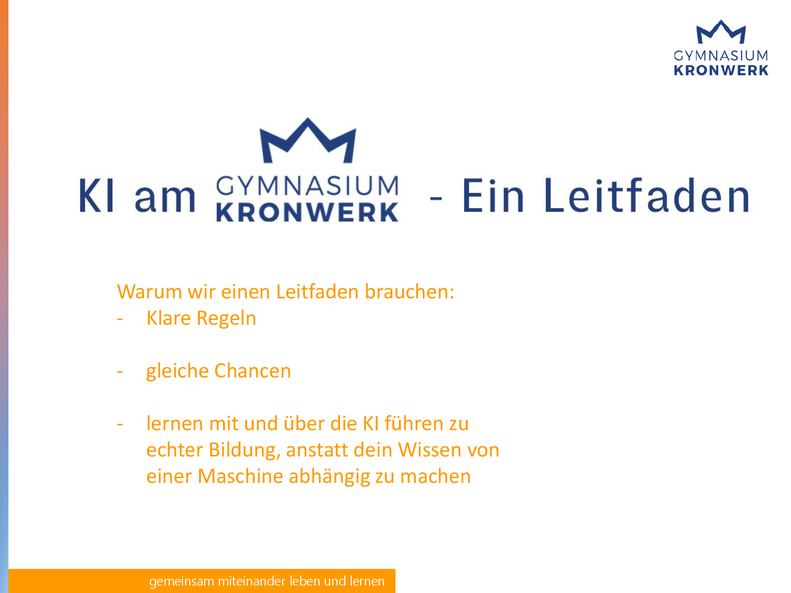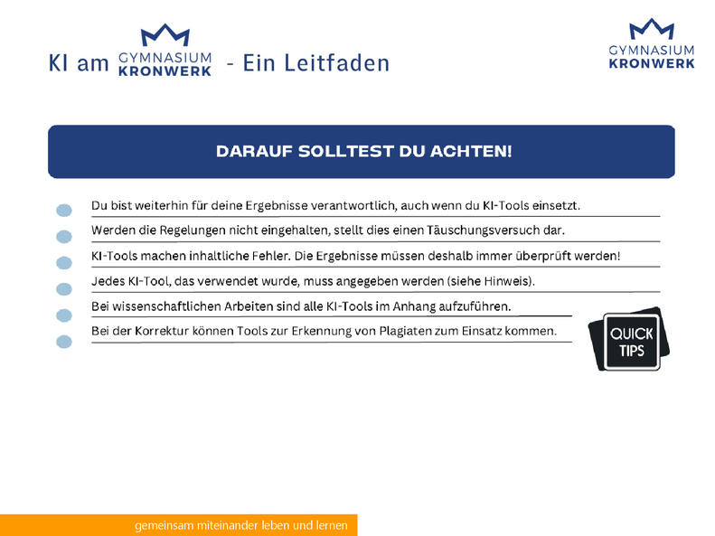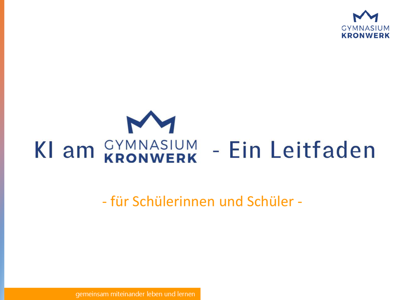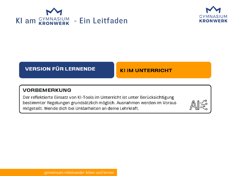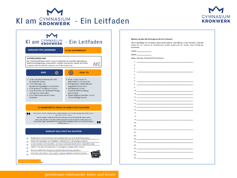 Der Handlungsleitfaden **„KI am Kronwerk“** bietet eine Orientierung zum verantwortungsvollen Einsatz von Künstlicher Intelligenz im Schulalltag. Er betont klare Regeln, gleiche Chancen und die Bedeutung, KI als Lernwerkzeug und nicht als Ersatz für eigenes Denken zu nutzen. Ziel ist es, Schülerinnen und Schüler zu befähigen, mit und über KI zu lernen, um echte Bildung zu fördern. Das Dokument begleitet die SE-Tage im Februar und steht unter dem Leitmotiv „gemeinsam miteinander leben und lernen“.