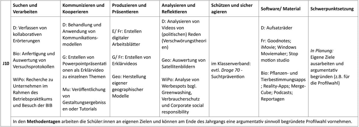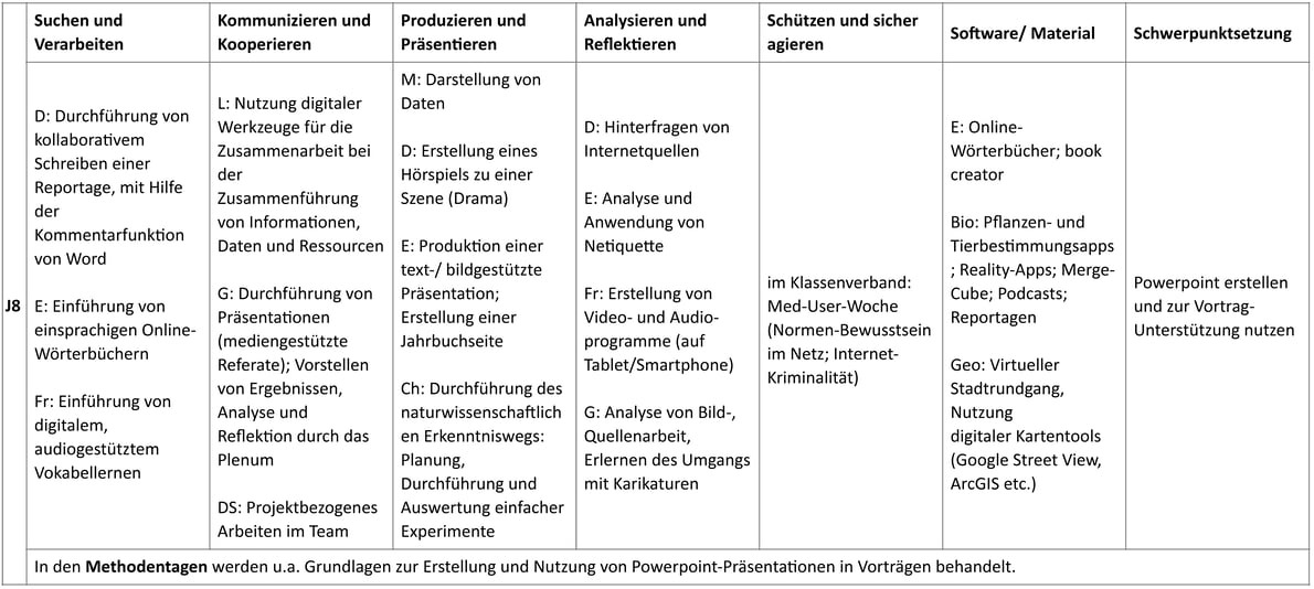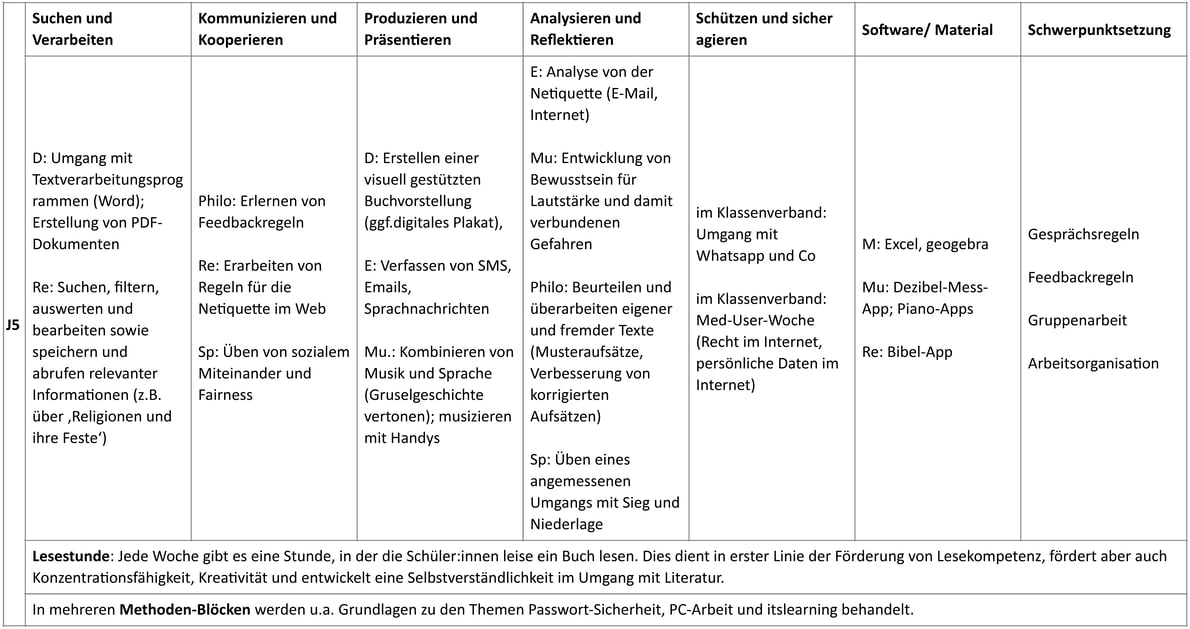 Lernen mit Medien und Lernen über Medien in den Kompetenzbereichen der KMK-Strategie "Bildung in der digitalen Welt"wird immer wichtiger. Angelehnt an die sechs Anforderungen aus dem Strategiepapier beschreibt unser Medienkonzept einen Überblick, in welcher Jahrgangsstufe (J) welche Medien verwendet oder thematisiert werden.